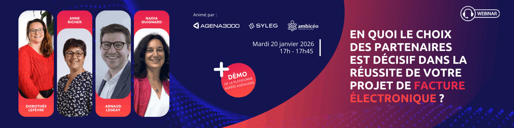 Retrouvez le replay de notre webinar avec nos experts de Syleg, Ambicéo et de la plateforme Agrée par l’Etat, AGENA3000 pour un webinar sur le thème : « En quoi le choix des partenaires est décisif dans la réussite de votre projet de facture électronique ».